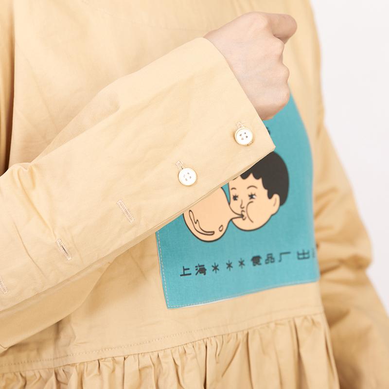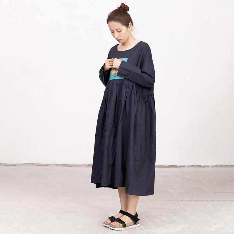 Literature Chic Printing Long Sleeves Splicing PLeated Women Dress