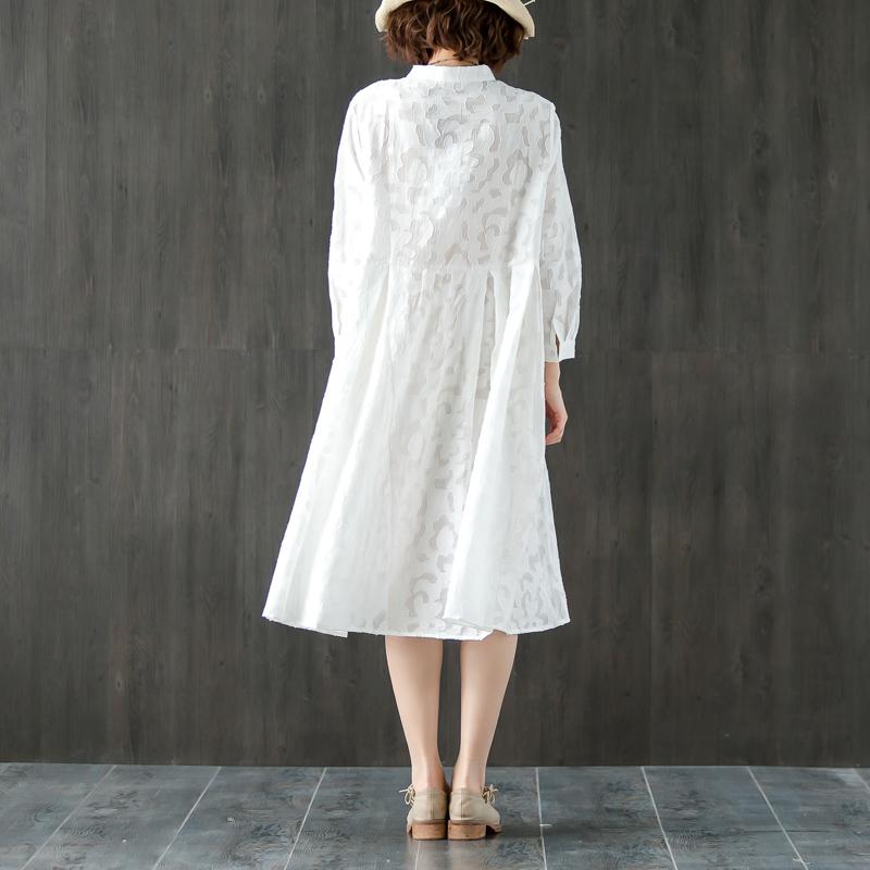 Long Sleeve Stand Collar Loose White Pleated Dress