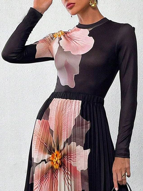Long Sleeves Asymmetric Floral Printed Split-Joint Round-Neck T-Shirts Tops