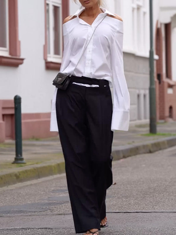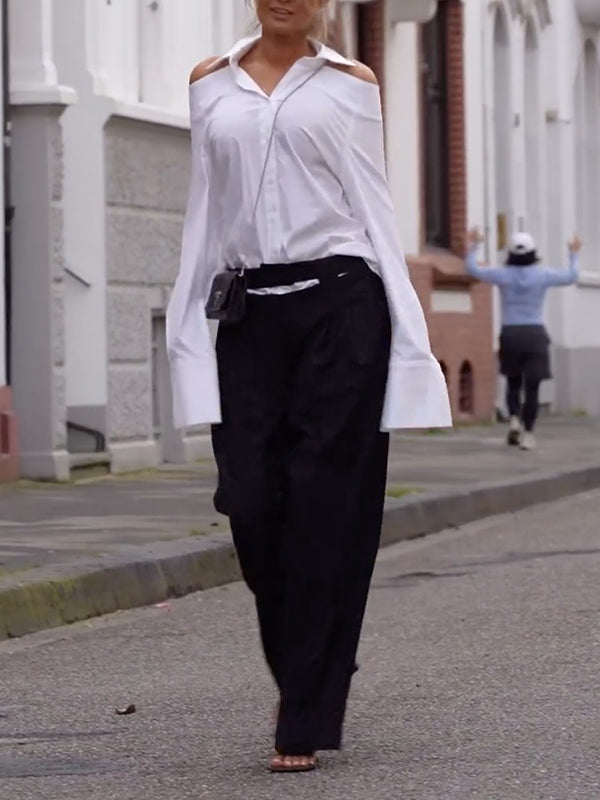 Long Sleeves Buttoned Solid Color Cold Shoulder Blouses&Shirts Tops
