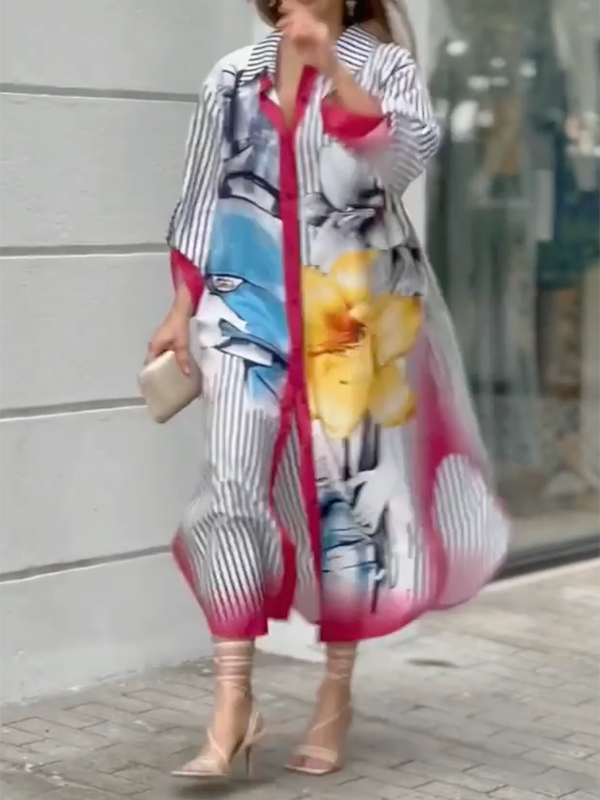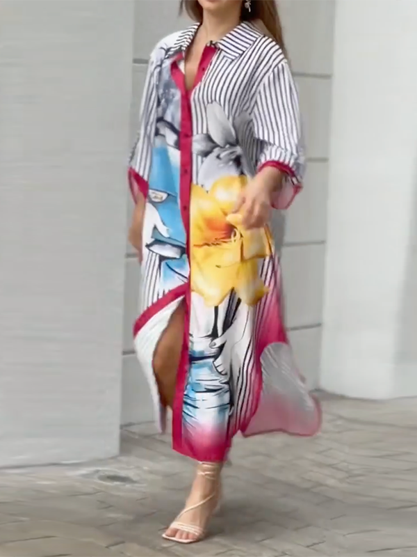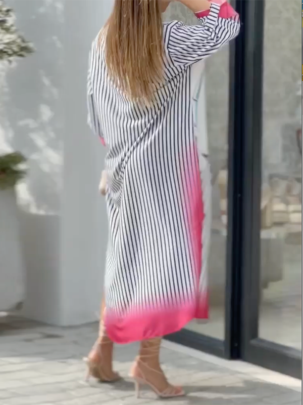 Long Sleeves Loose Asymmetric Printed Striped Lapel Collar Midi Dresses