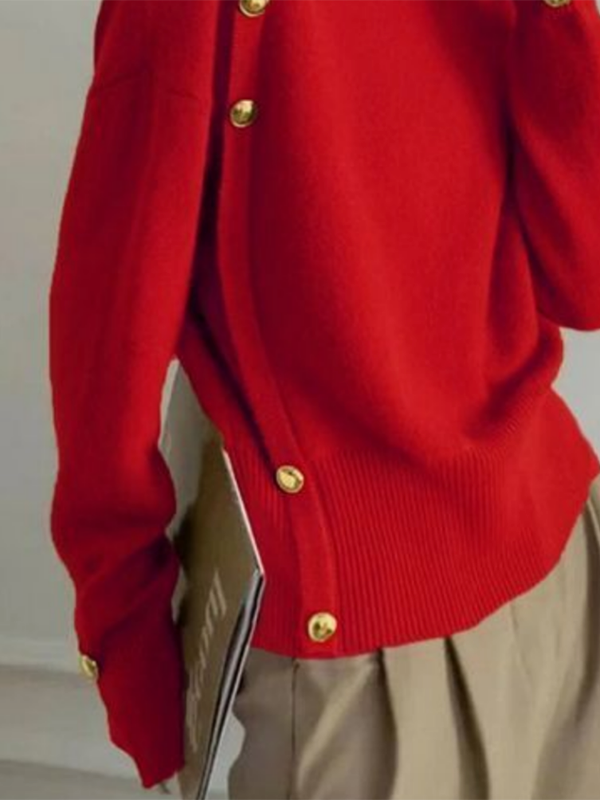 Long Sleeves Loose Beaded Solid Color Split-Side High Neck Sweater Tops
