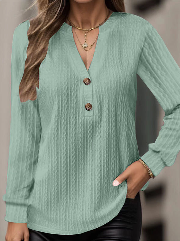 Long Sleeves Loose Buttoned Deep V-Neck T-Shirts Tops