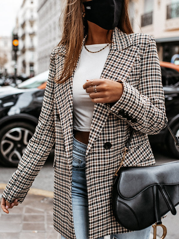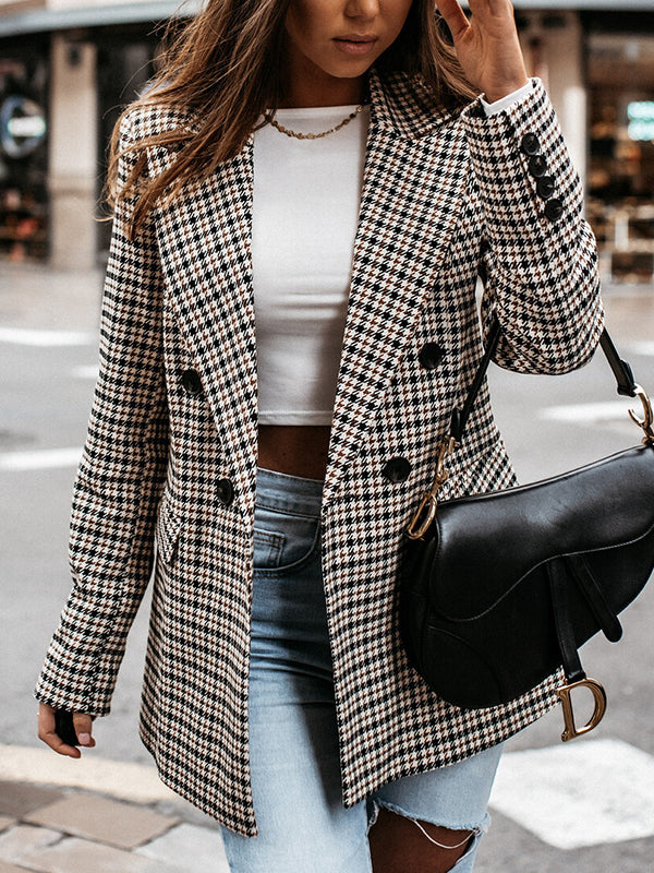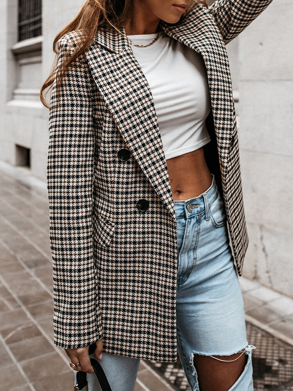 Long Sleeves Loose Buttoned Houndstooth Notched Collar Blazer Outerwear