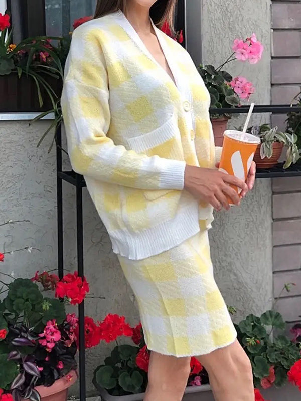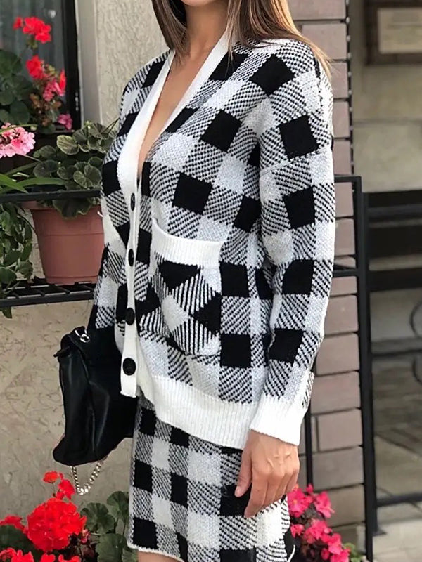 Long Sleeves Loose Buttoned Plaid Pockets Split-Joint V-Neck Cardigan Tops + Skirts Bottom Two Pieces Set