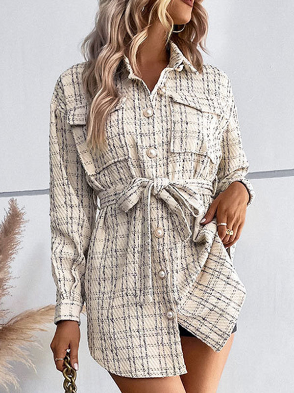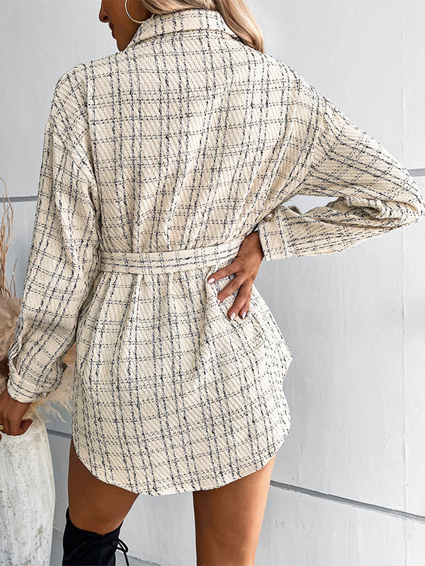 Long Sleeves Loose Buttoned Plaid Pockets Tied Waist Lapel Outerwear