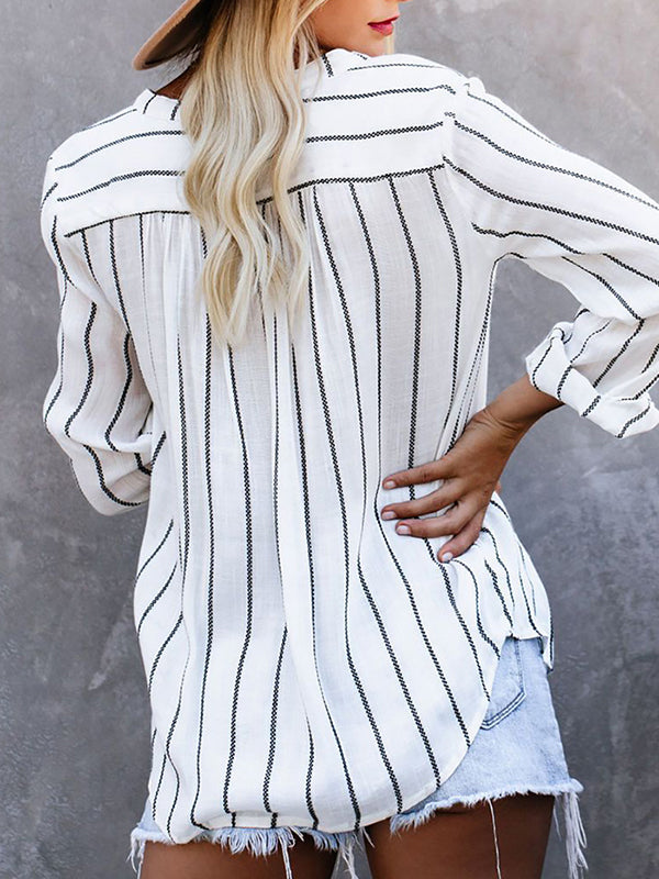 Long Sleeves Loose Buttoned Pockets Striped V-Neck Blouses&Shirts Tops