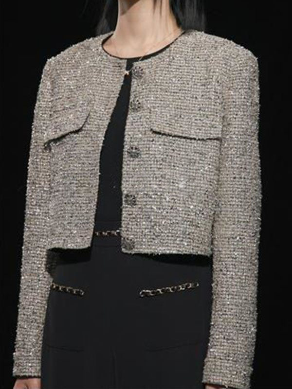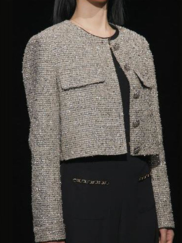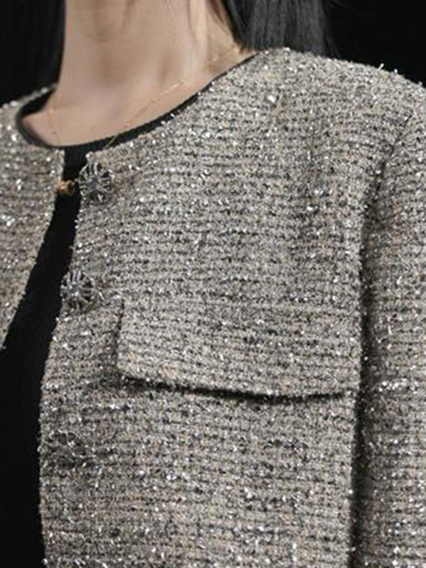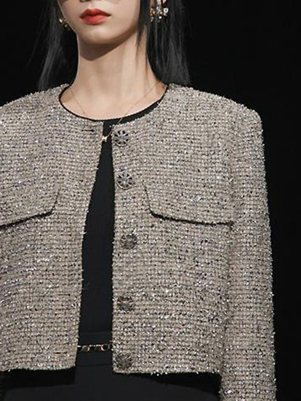 Long Sleeves Loose Buttoned Pockets Weave Round-Neck Outerwear