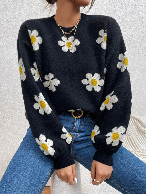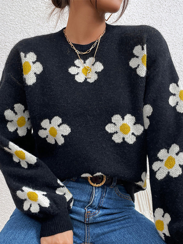 Long Sleeves Loose Contrast Color Floral Printed Split-Joint Round-Neck Sweater Tops