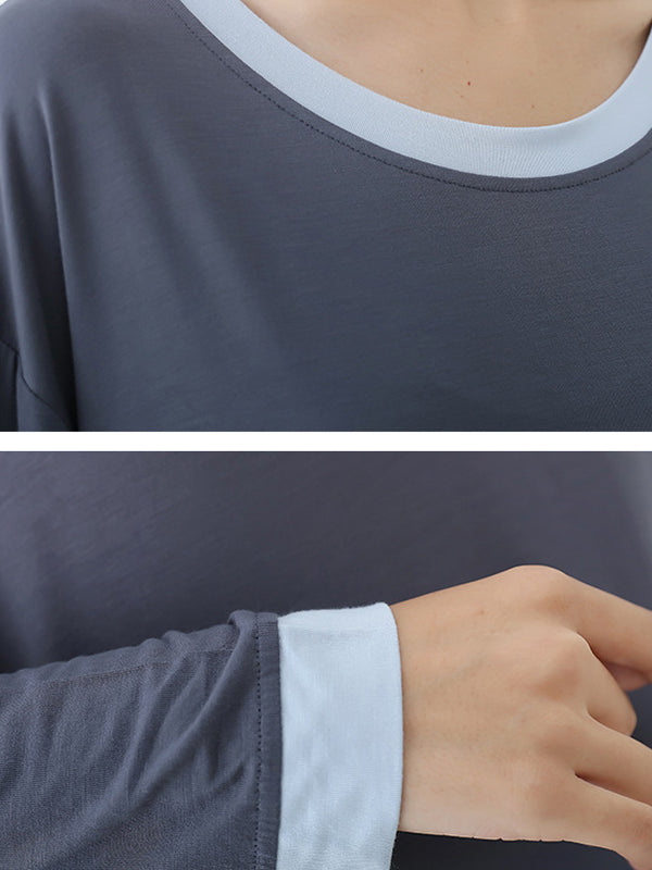 Long Sleeves Loose Contrast Color Round-Neck Two Pieces Pajama Set