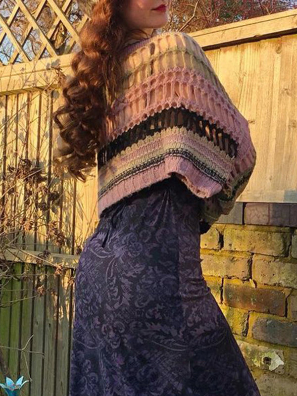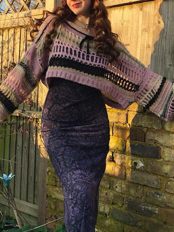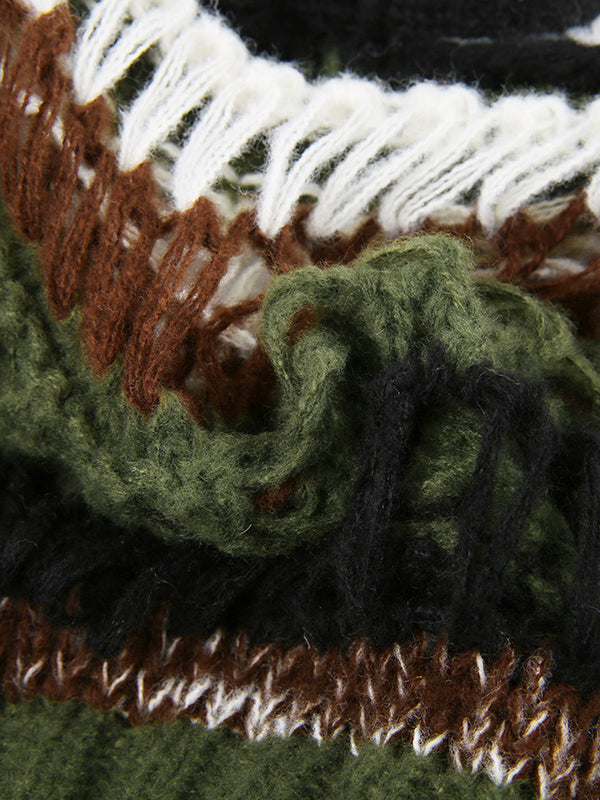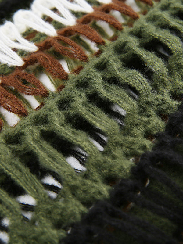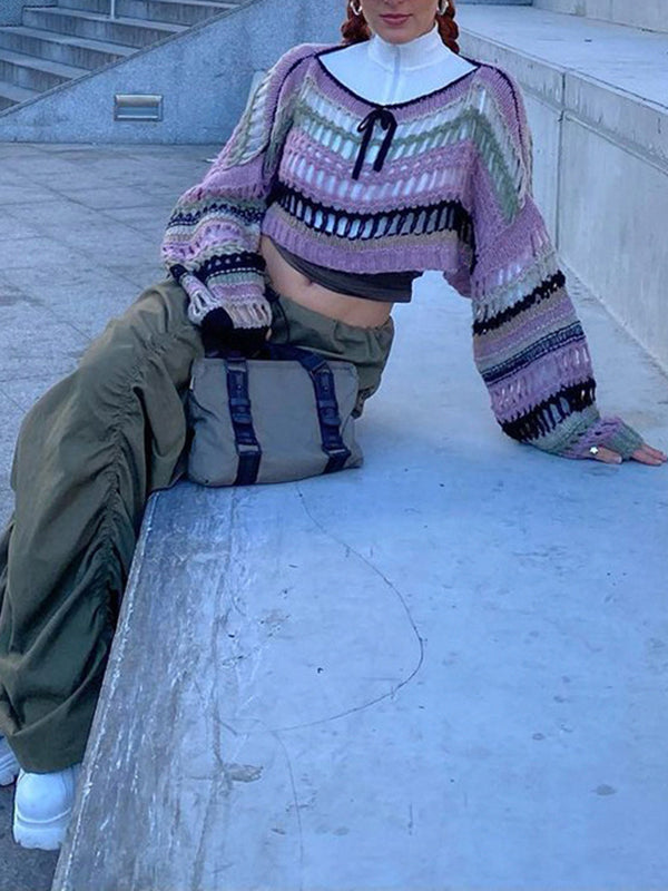 Long Sleeves Loose Drawstring Hollow Split-Joint Round-Neck Sweater Tops