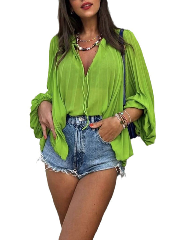 Long Sleeves Loose Elasticity Pleated Solid Color V-Neck Blouses&Shirts Tops