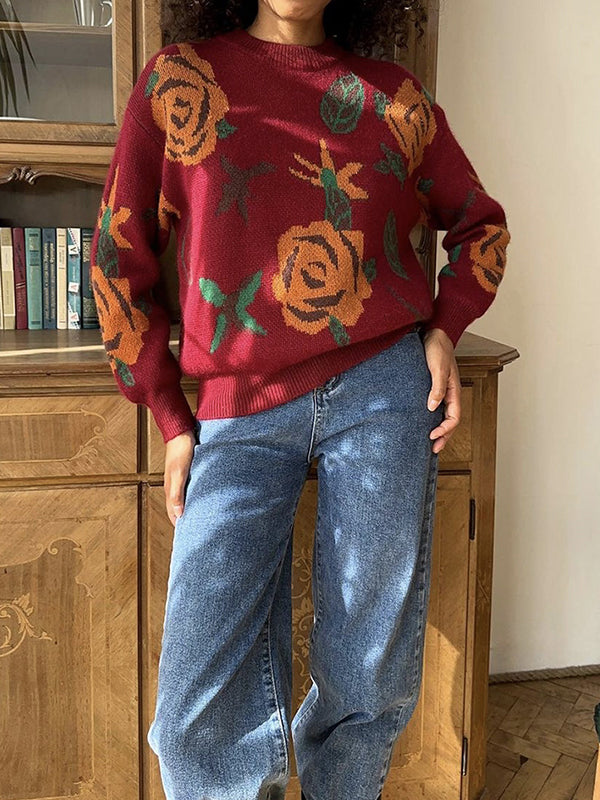 Long Sleeves Loose Flower Print Round-Neck Pullovers Sweater Tops