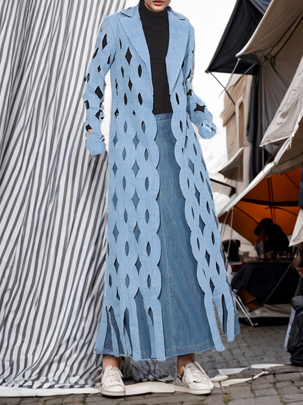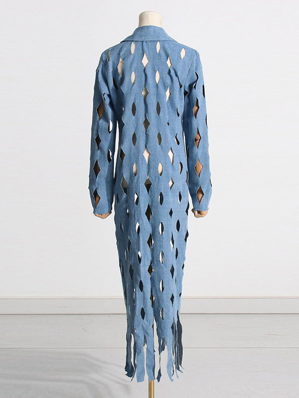 Long Sleeves Loose Hollow Solid Color Tasseled Notched Collar Denim Outerwear