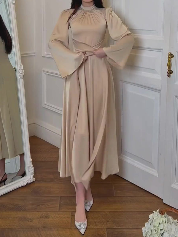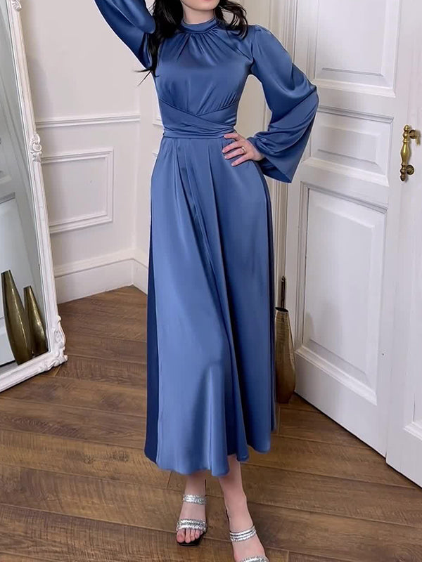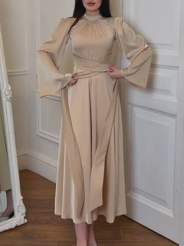 Long Sleeves Loose Pleated Solid Color Tied Waist Mock Neck Maxi Dresses