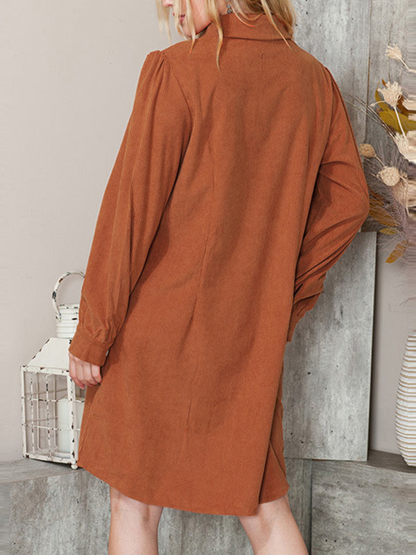 Long Sleeves Loose Pleated Split-Joint Lapel Mini Dresses Shirt Dress