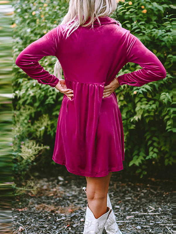 Long Sleeves Loose Pleated Split-Joint Velvet Lapel Mini Dresses Shirt Dress