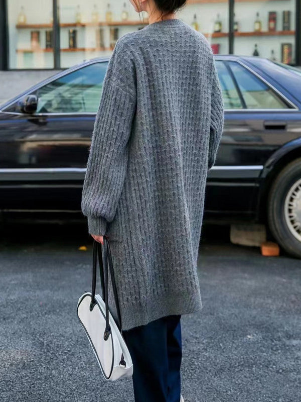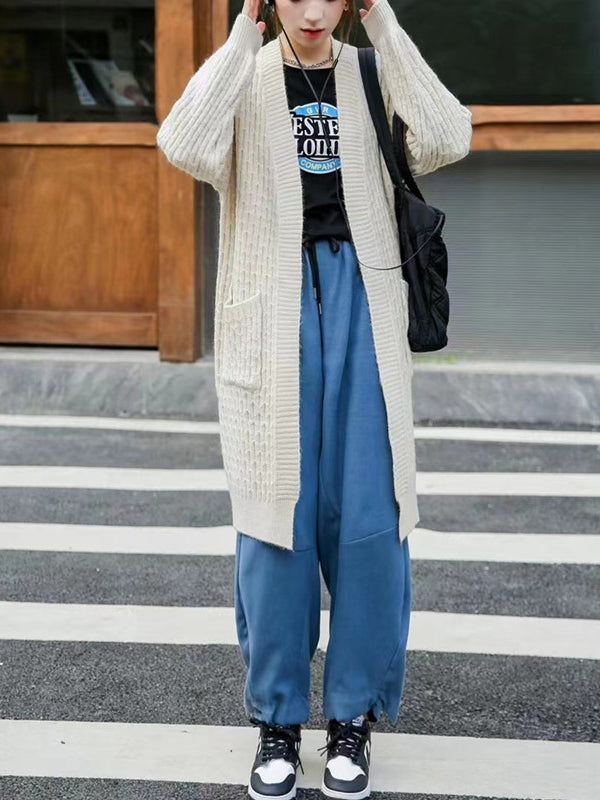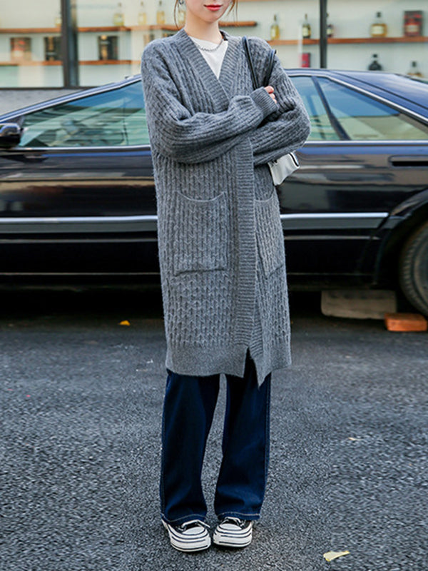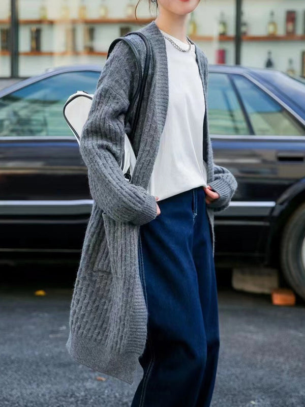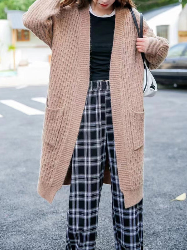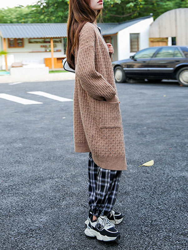 Long Sleeves Loose Pockets Solid Color Collarless Cardigan Tops