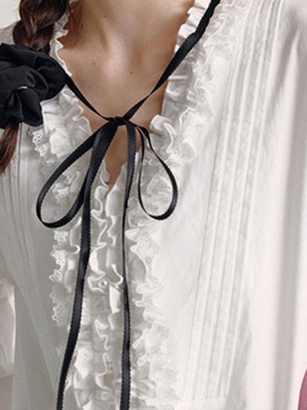 Long Sleeves Loose Ruffled Solid Color V-Neck Blouses&Shirts Tops