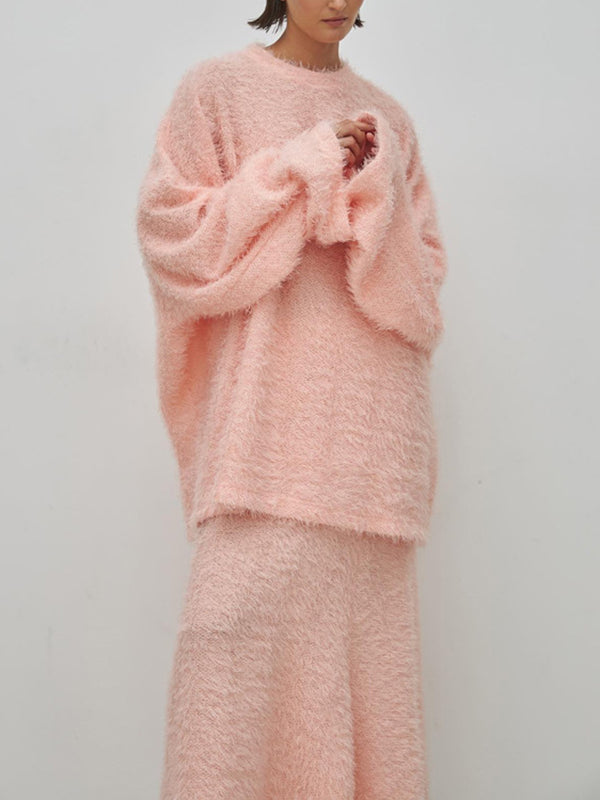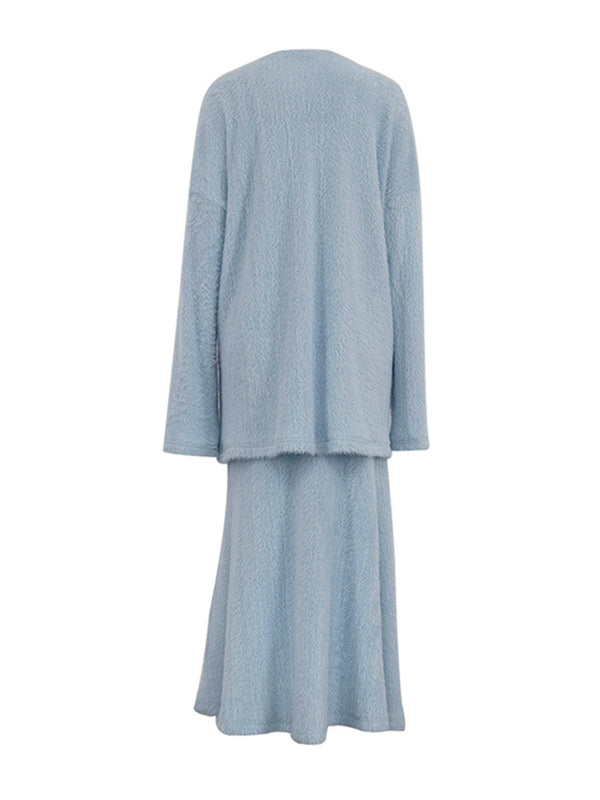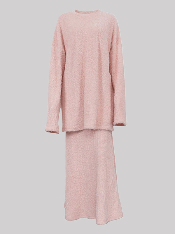 Long Sleeves Loose Solid Color Round-Neck Sweater Tops + Zipper Skirts Bottom Two Pieces Set