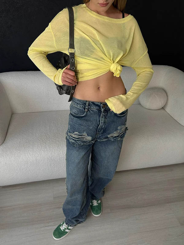 Long Sleeves Loose Solid Color Round-Neck T-Shirts Tops