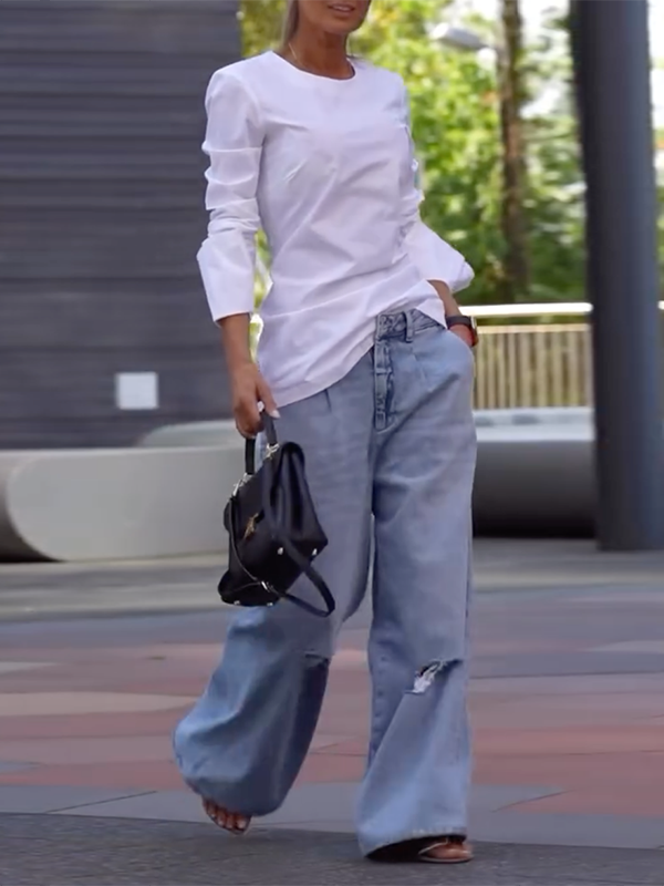 Long Sleeves Loose Solid Color Round-Neck T-Shirts Tops