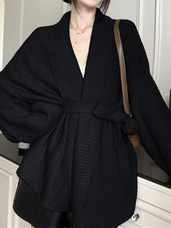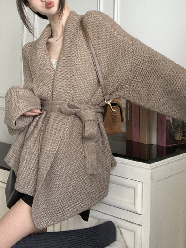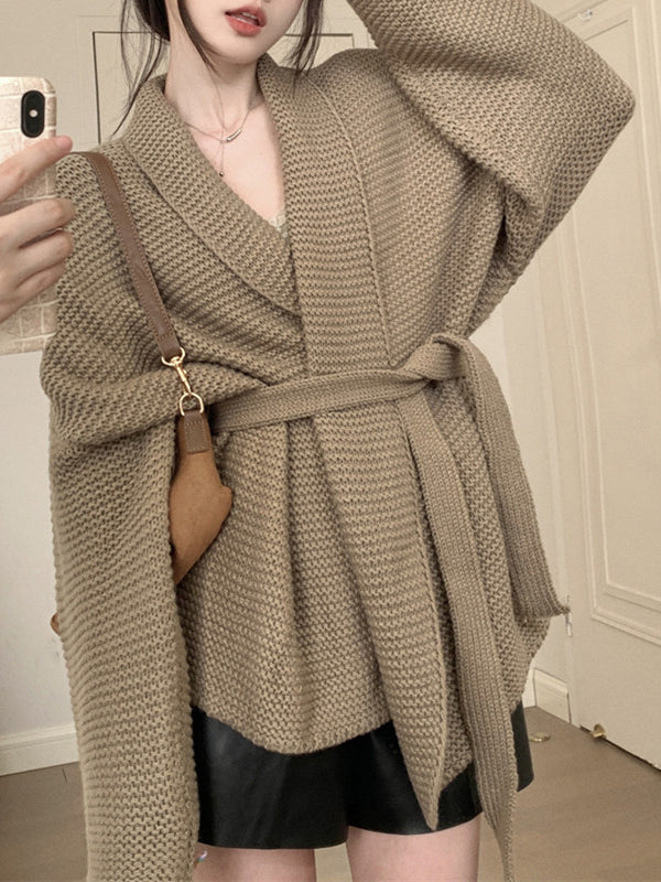 Long Sleeves Loose Solid Color Tied Waist V-Neck Cardigan Tops