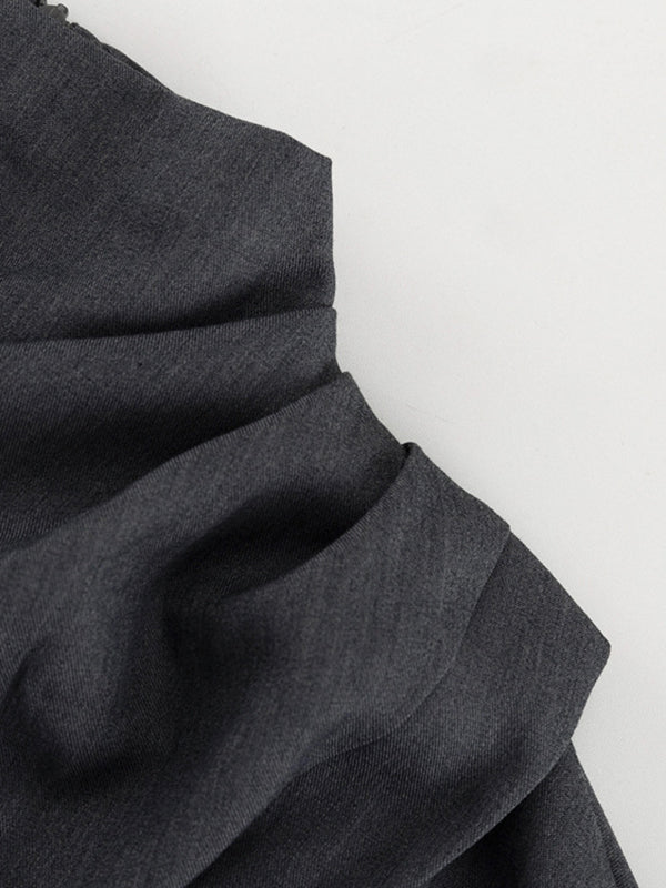 Long Sleeves Pleated Solid Color Stand Collar Blouses Tops + High Waisted Pants Bottom Two Pieces Set