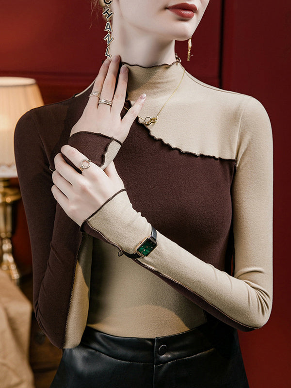 Long Sleeves Plus Size Contrast Color Ruffle Trim Split-Joint Mock Neck T-Shirts Tops