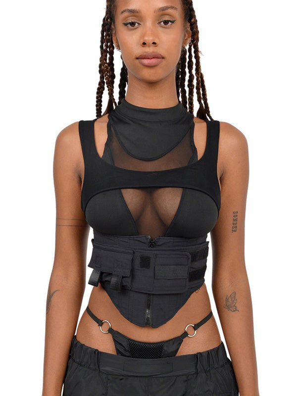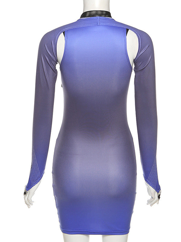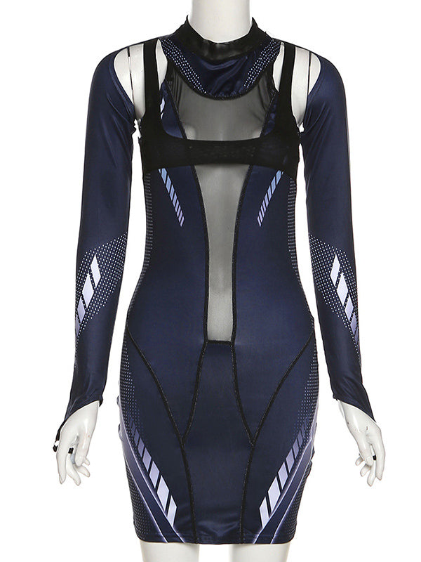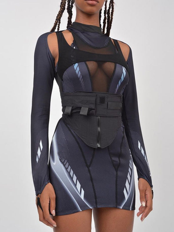 Long Sleeves Printed Mesh Split-Joint Mini Dress&Vest Suits