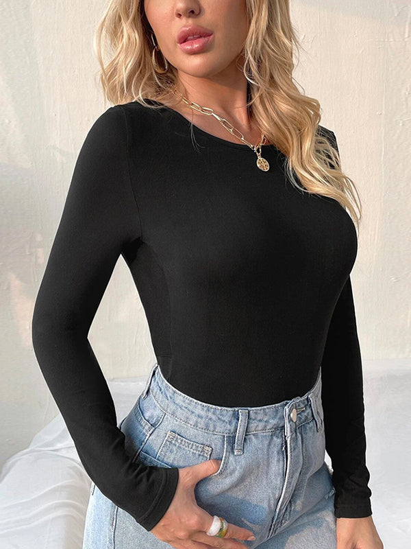 Long Sleeves Skinny Backless Knot Solid Color Round-Neck T-Shirts Tops