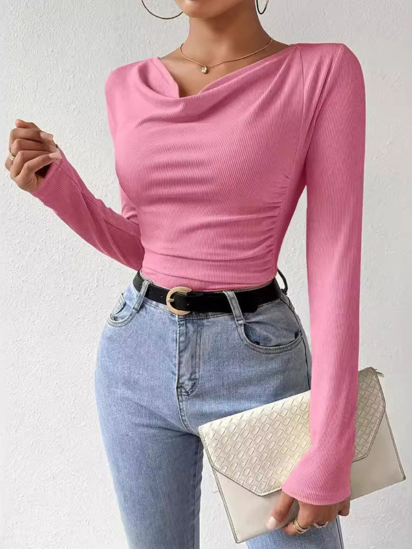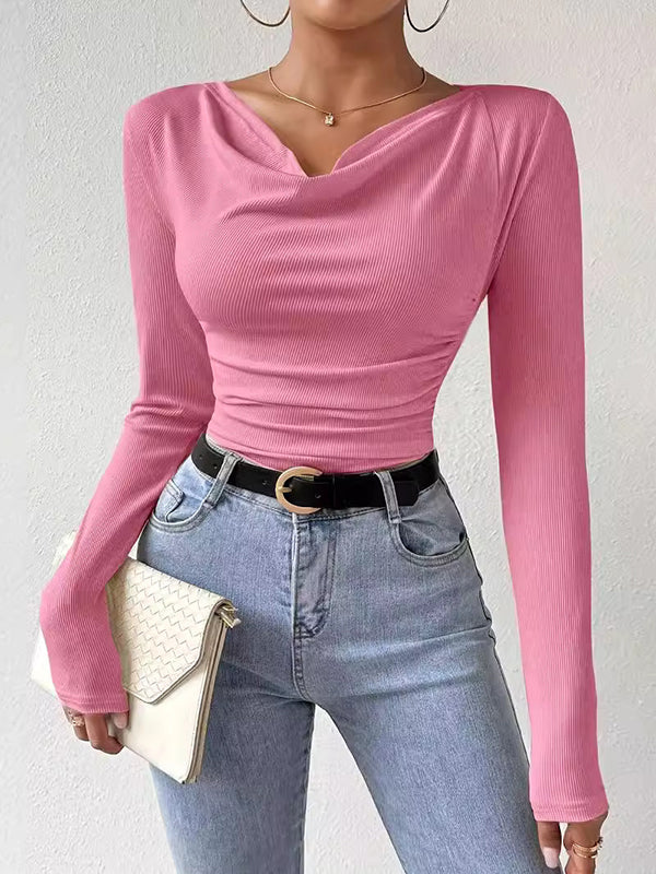 Long Sleeves Skinny Pleated Solid Color Split-Joint V-Neck T-Shirts Tops