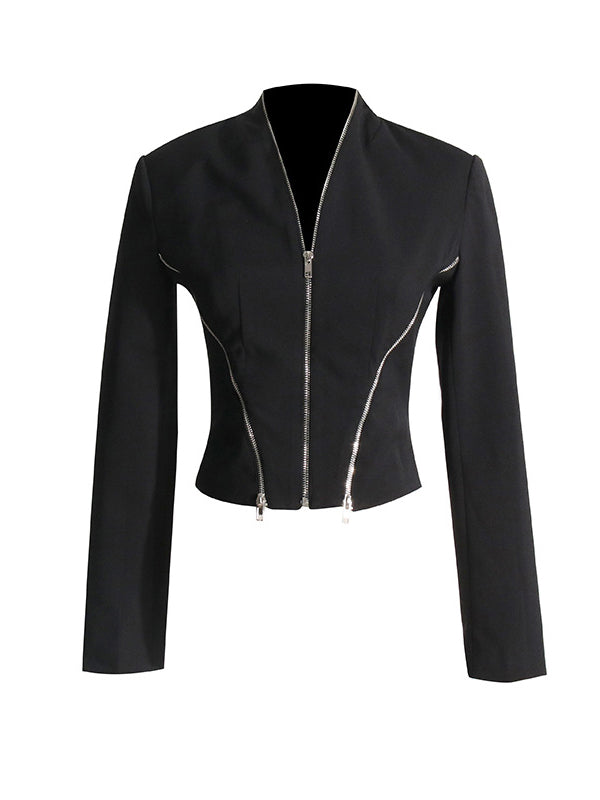 Long Sleeves Split-Joint Zipper V-neck Jackets Outerwear