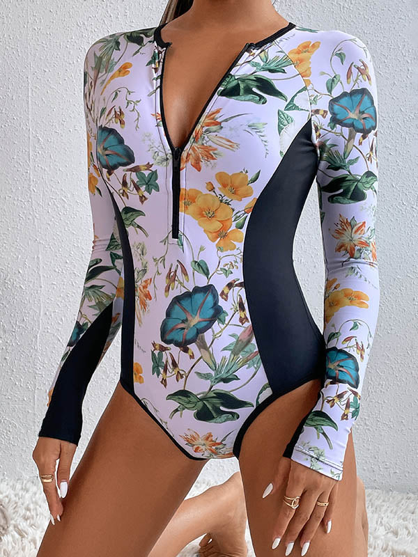 Long Sleeves Zipper Floral Printed Split-Joint One-Piece Wetsuits