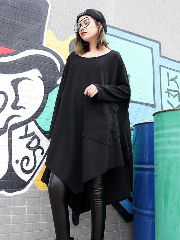 Loose Black Round-neck Asymmetric T-shirt Dress