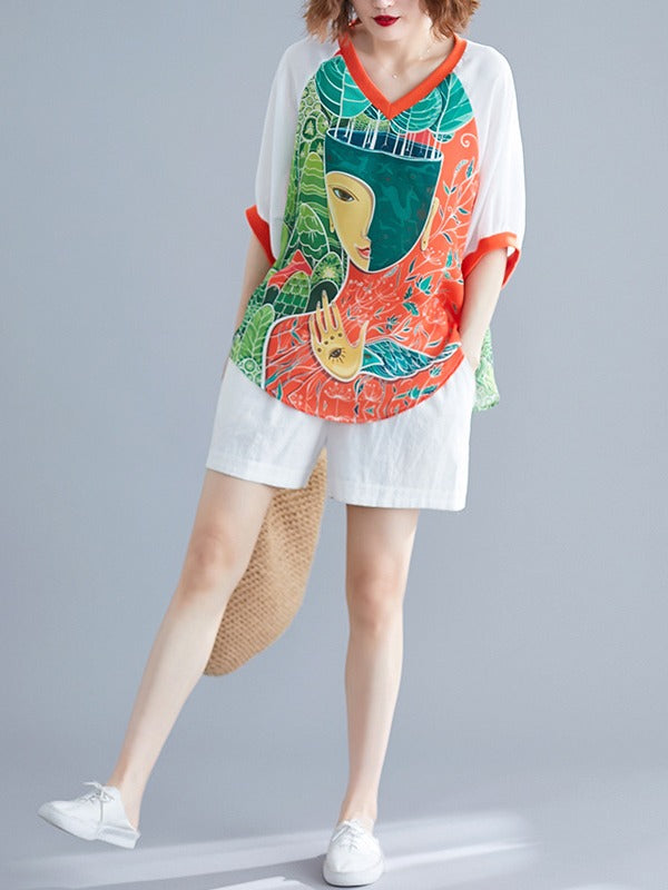 LOOSE CARTOON PRINTED V-NECK T-SHIRTS