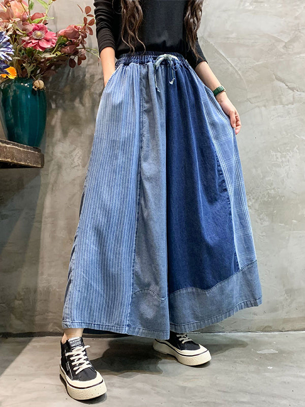 Loose Drawstring Elasticity Plaid Split-Joint Ninth Jean Pants Bottoms