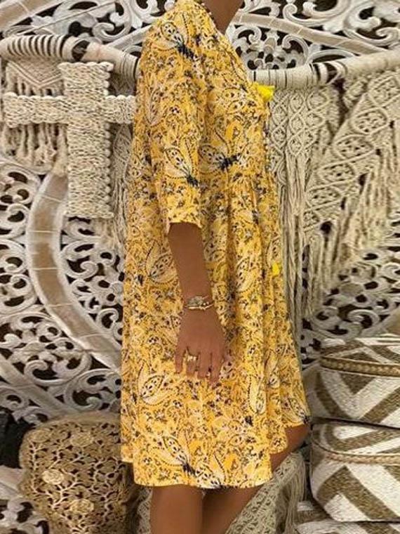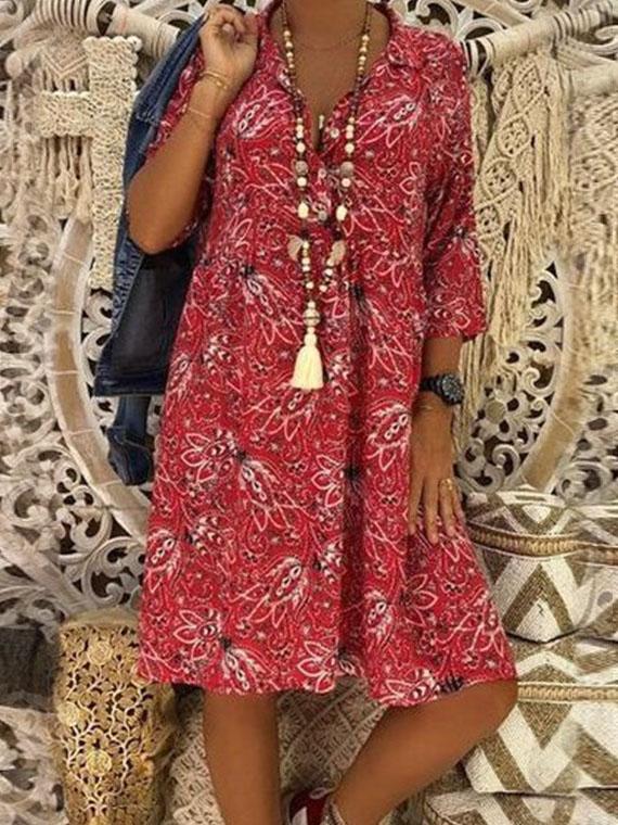 Loose Floral V-neck Seven-Quarter Sleeve Midi Dress