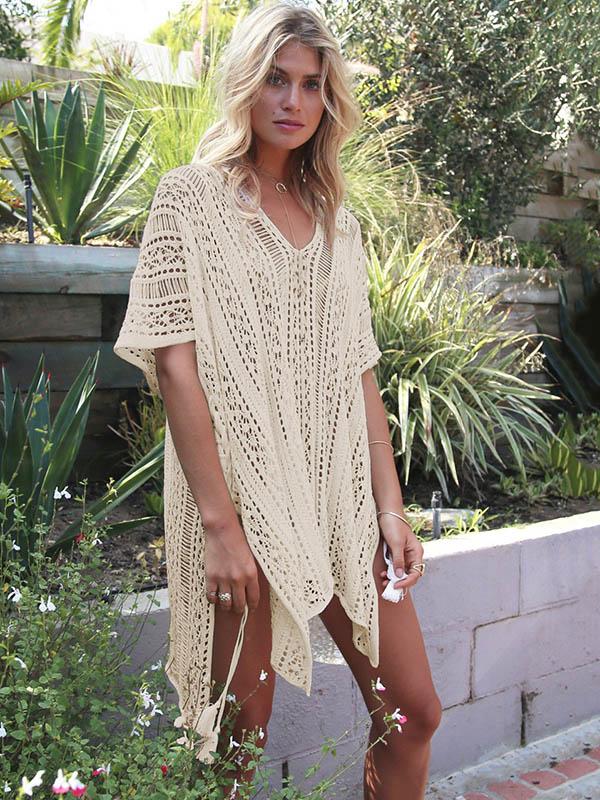 Loose Hollow Vacation Half Sleeve V Neck Beach Cover-Ups