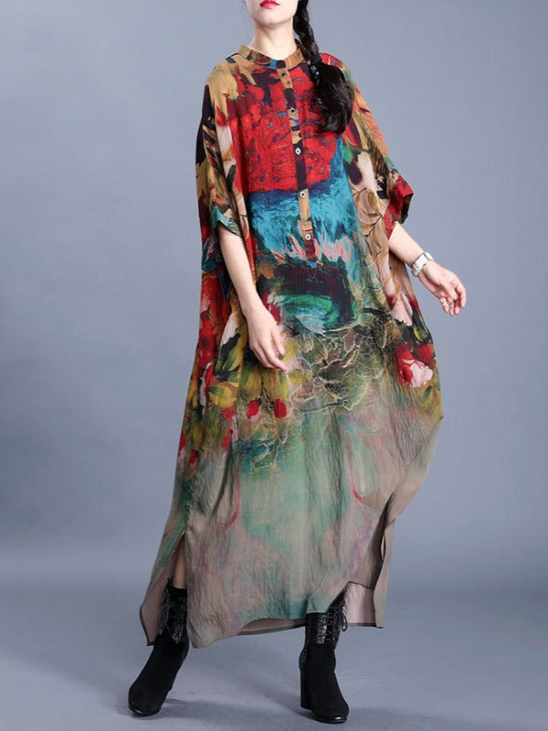 LOOSE PRINTED SILK SPLIT-SIDE MAXI DRESS