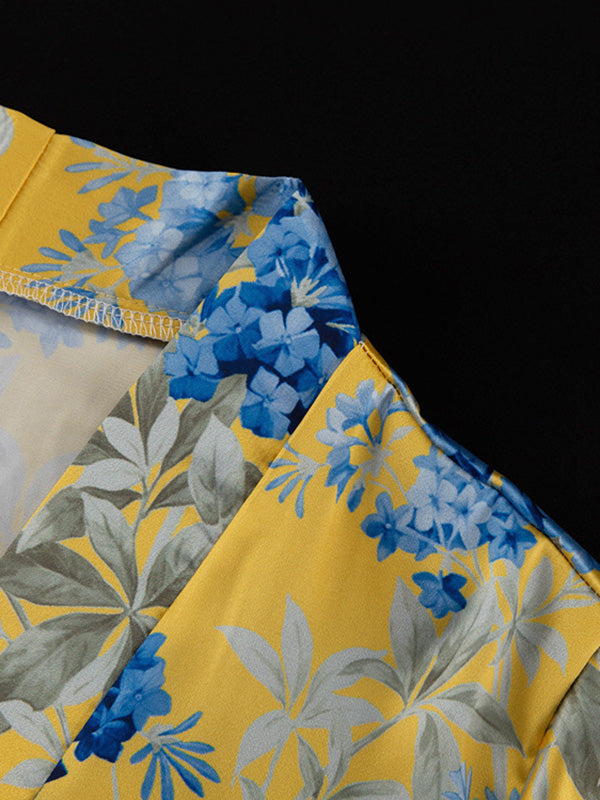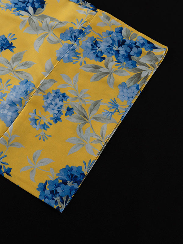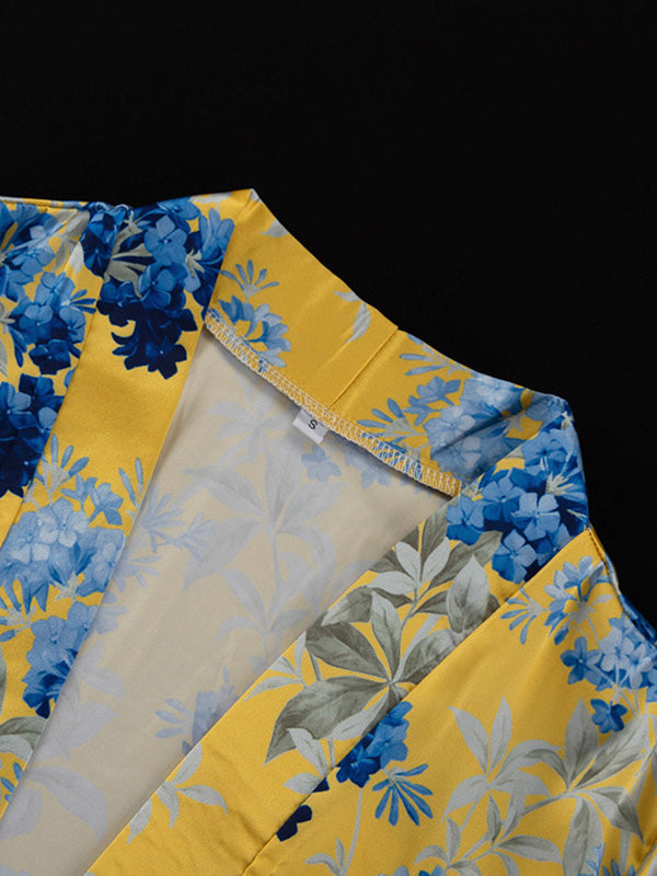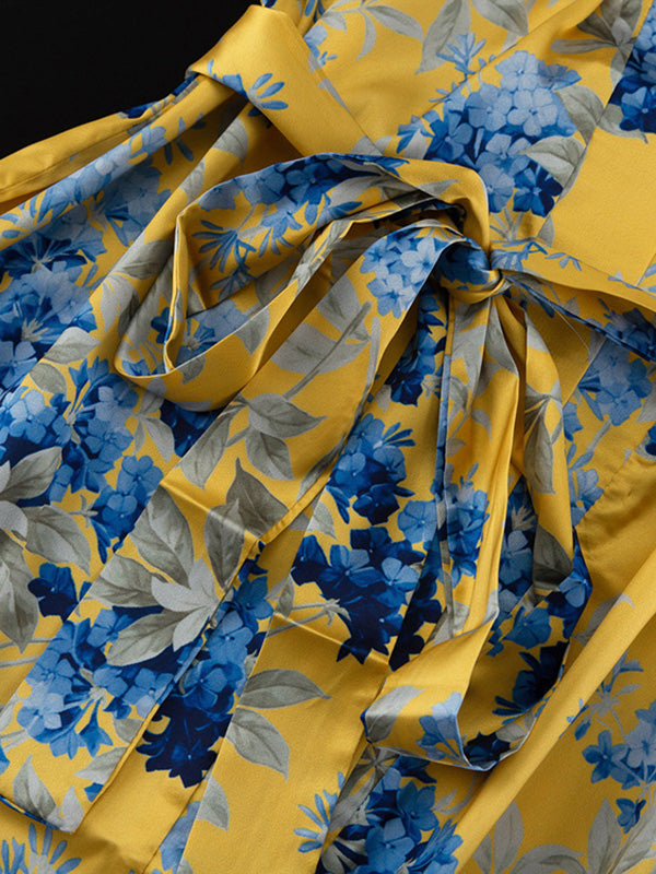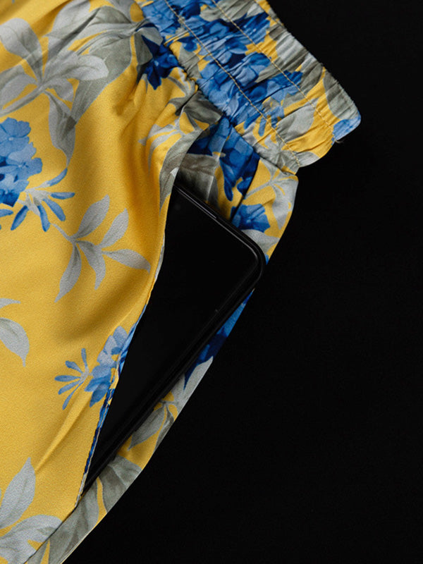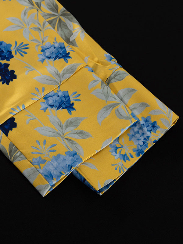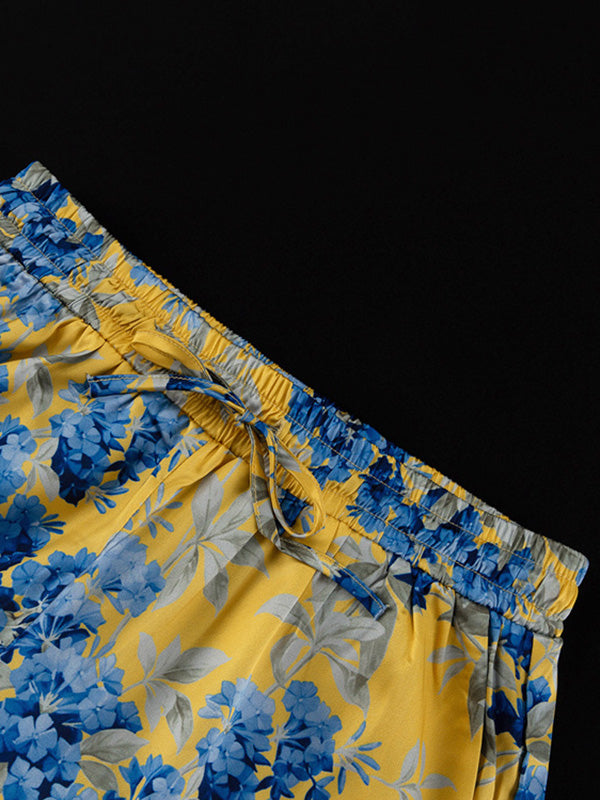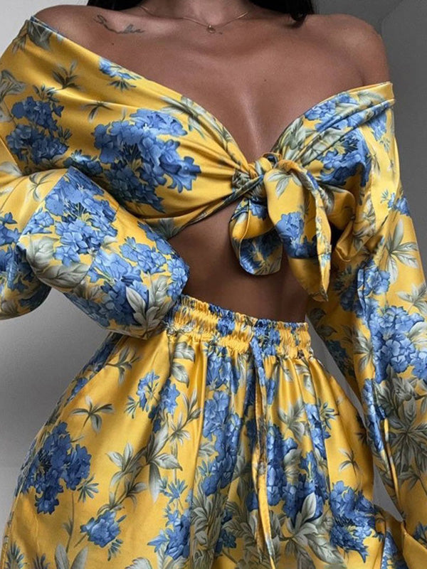 Loose Printed Split-Joint Deep V-Neck Lace-Up Blouse + Drawstring Elasticity Pants Trousers Two Pieces Set