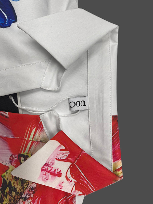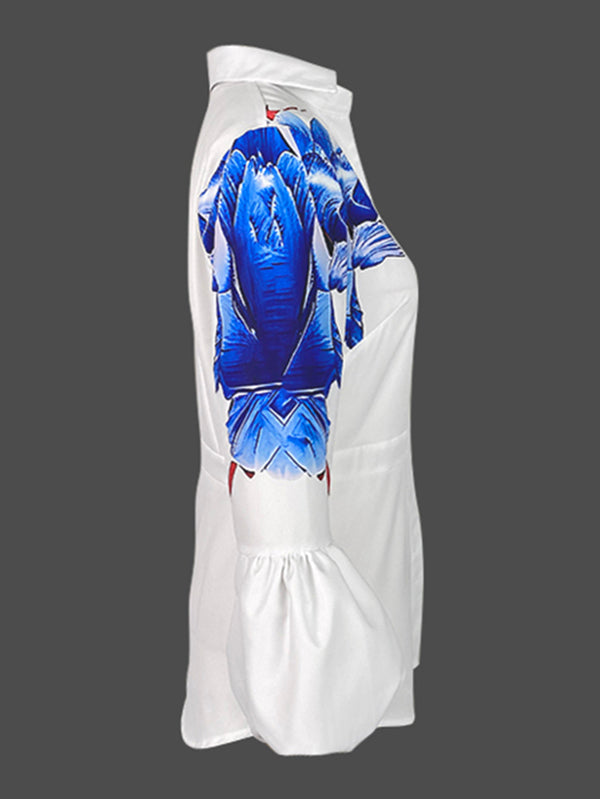 Loose Puff Sleeves Buttoned Flower Print Split-Joint Lapel Blouses&Shirts Tops