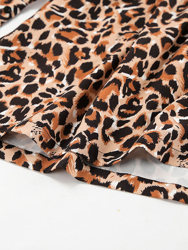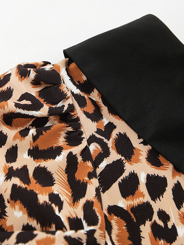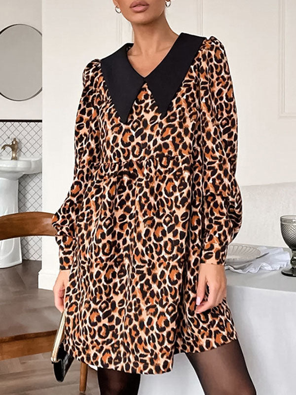 Loose Puff Sleeves Leopard Pleated Printed Split-Joint Peter Pan Collar Mini Dresses Shirt Dress