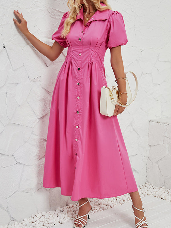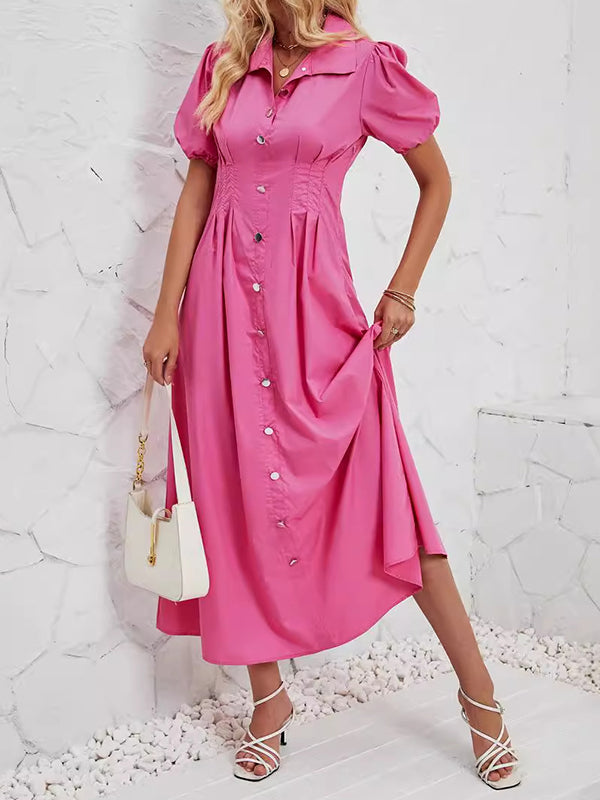 Loose Puff Sleeves Pleated Split-Joint Lapel Maxi Dresses Shirt Dress