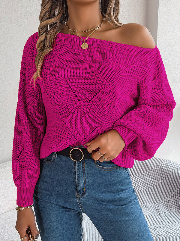 Loose Puff Sleeves Solid Color Split-Joint Round-Neck Sweater Tops