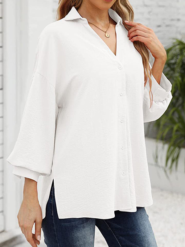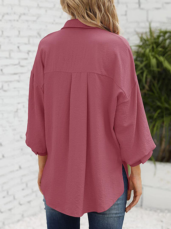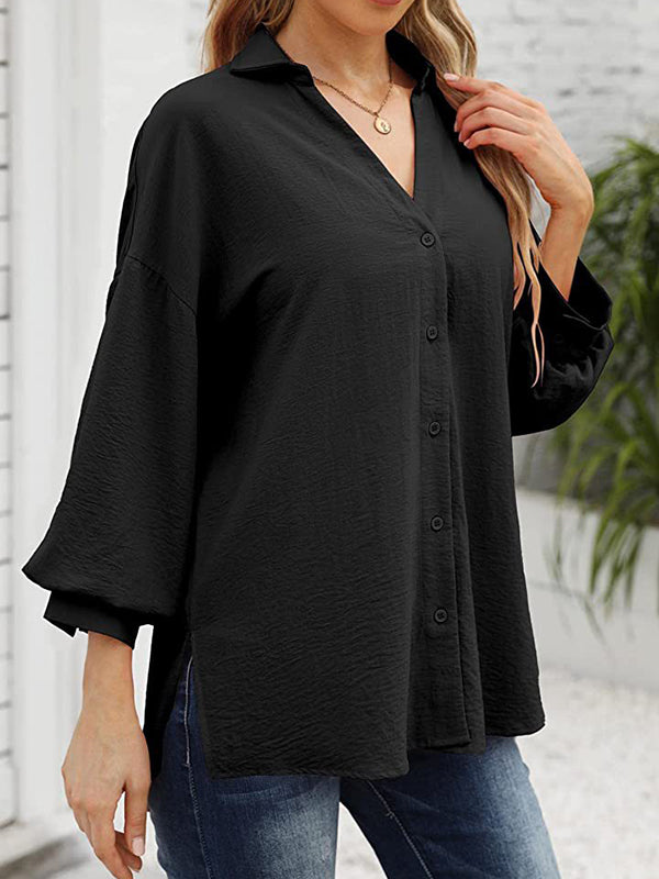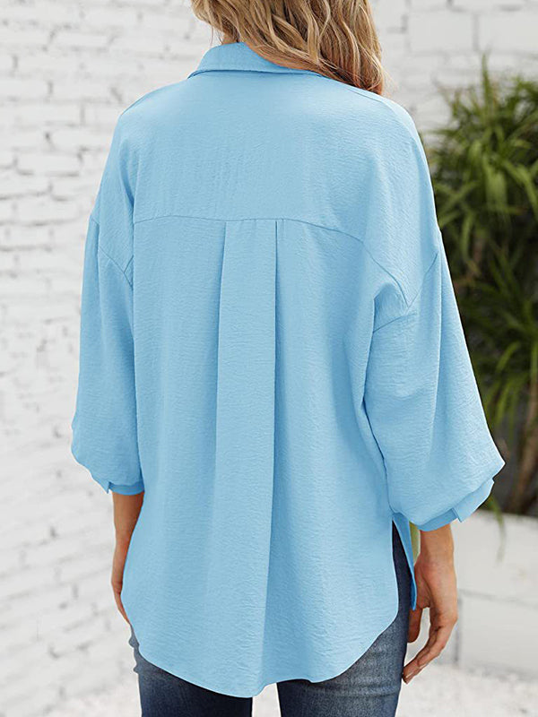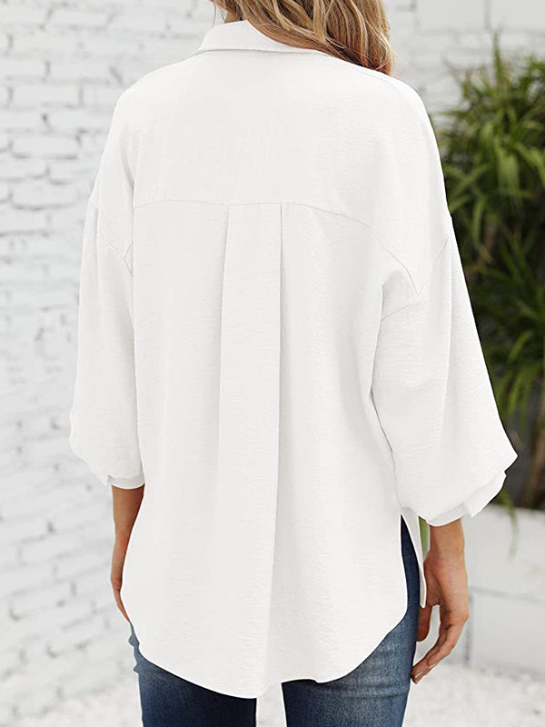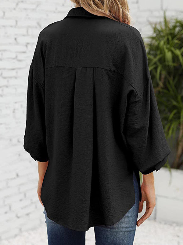 Loose Puff Three-Quarter Sleeves Solid Color Lapel Blouses
