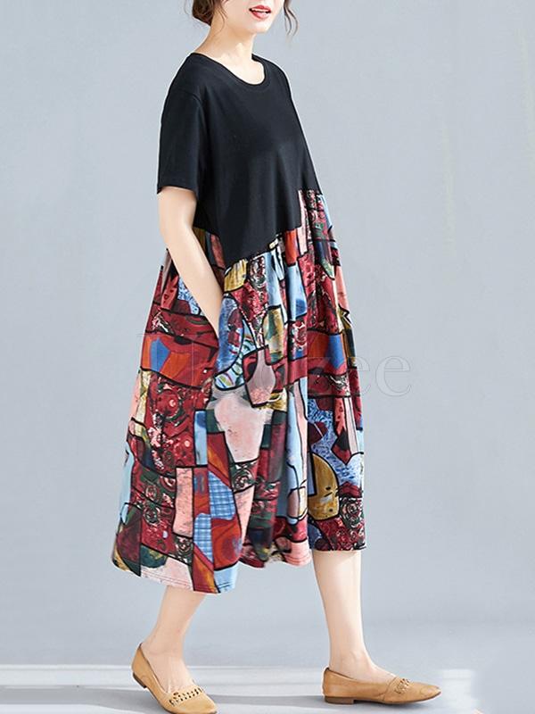 Loose Ramie Cotton Split-joint Floral Printed Midi Dress