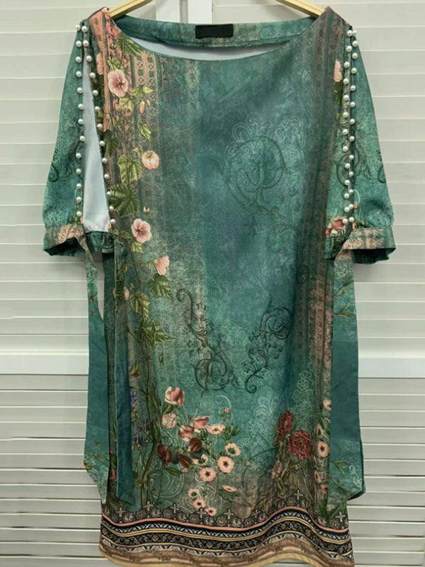 Loose Short Sleeves Hollow Printed Split-Joint Round-Neck Mini Dresses