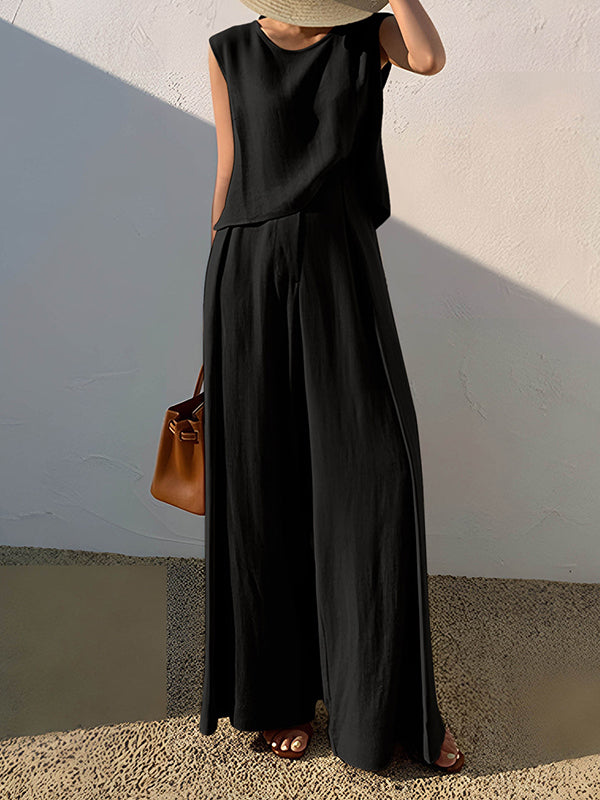 Loose Short Sleeves Hollow Solid Color Split-Joint Round-Neck Vest Top