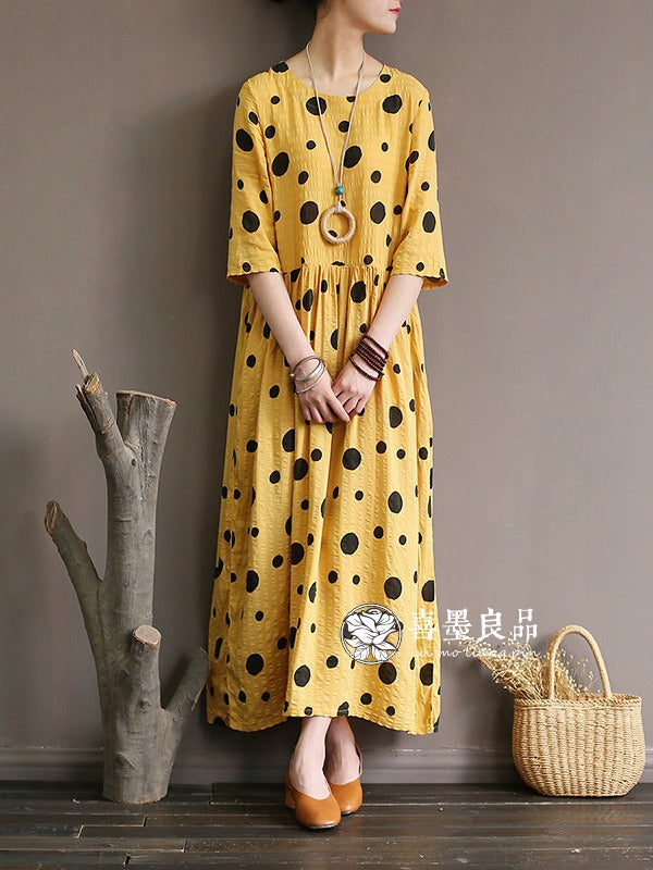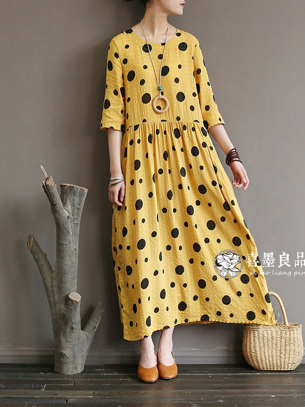 LOOSE SIMPLE POLKA-DOT COTTON LONG DRESS